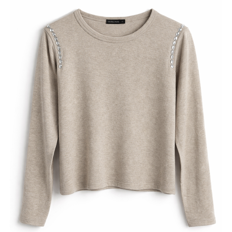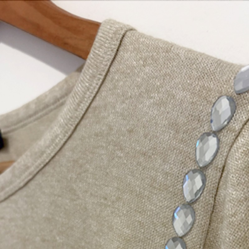 No es un básico más. Tampoco es una prenda que guardás para una ocasión especial. Te lo ponés y levanta el look en un segundo. Lanilla angora suave, liviana, con cuerpo. El diseño en pedrería en cada hombro le dan un punto de luz preciso que transforma lo simple sin recargarlo.