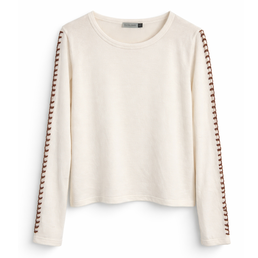 Suéter de lanilla angora con bordado en los hombros que aporta un detalle sin sobrecargar. El tipo de prenda que resuelve el look. Simple, pero con intención.