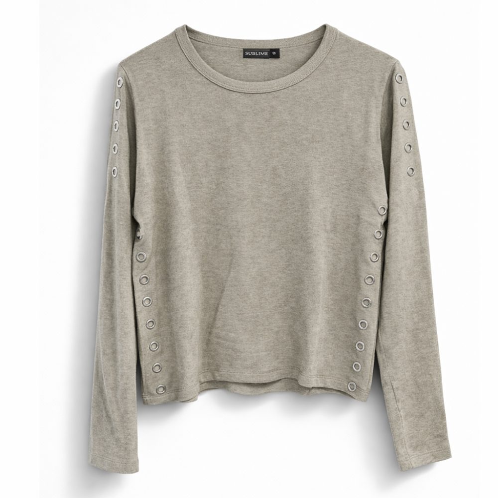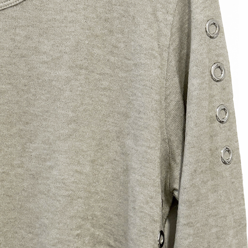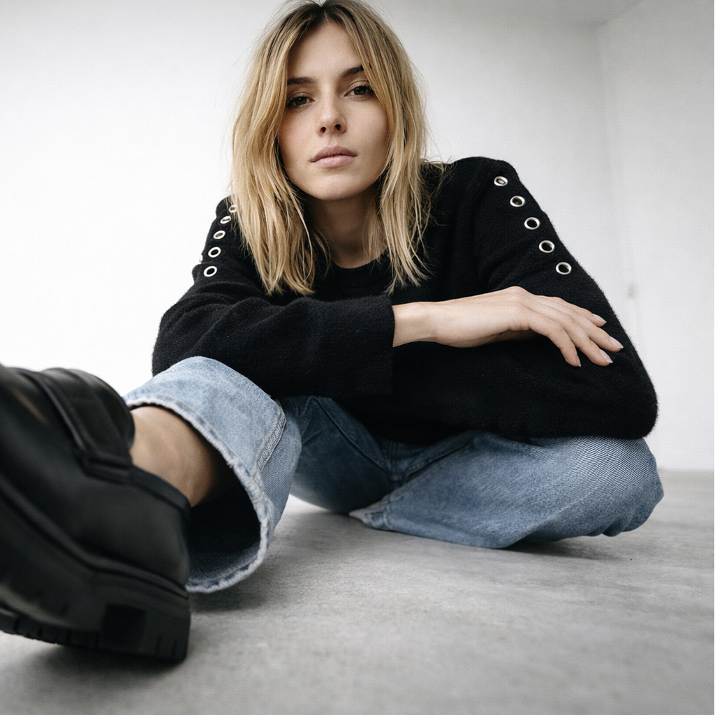 Suéter de lanilla angora, de moldería cómoda y caída que favorece. Las arandelas en hombros y costados aportan un detalle sutil y distinto. Te lo ponés con lo que ya tenés y te levanta el look.
