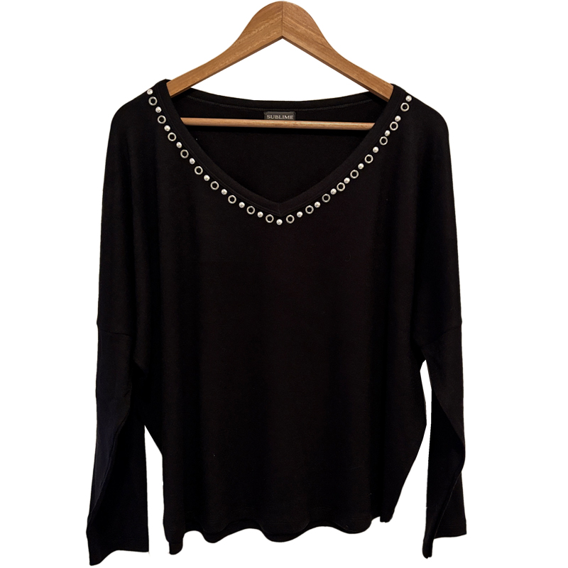 Suéter de lanilla angora, con cuello en V y mangas largas con detalle delicado de tachas y arandelas en el cuello