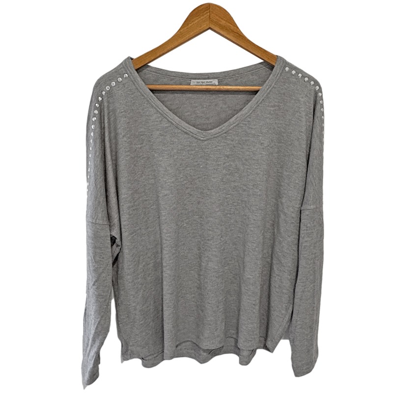 Sueter confeccionado en tejido de lanilla angora con cuello en V y mangas largas. Con detalle de tachas bombe en los hombros